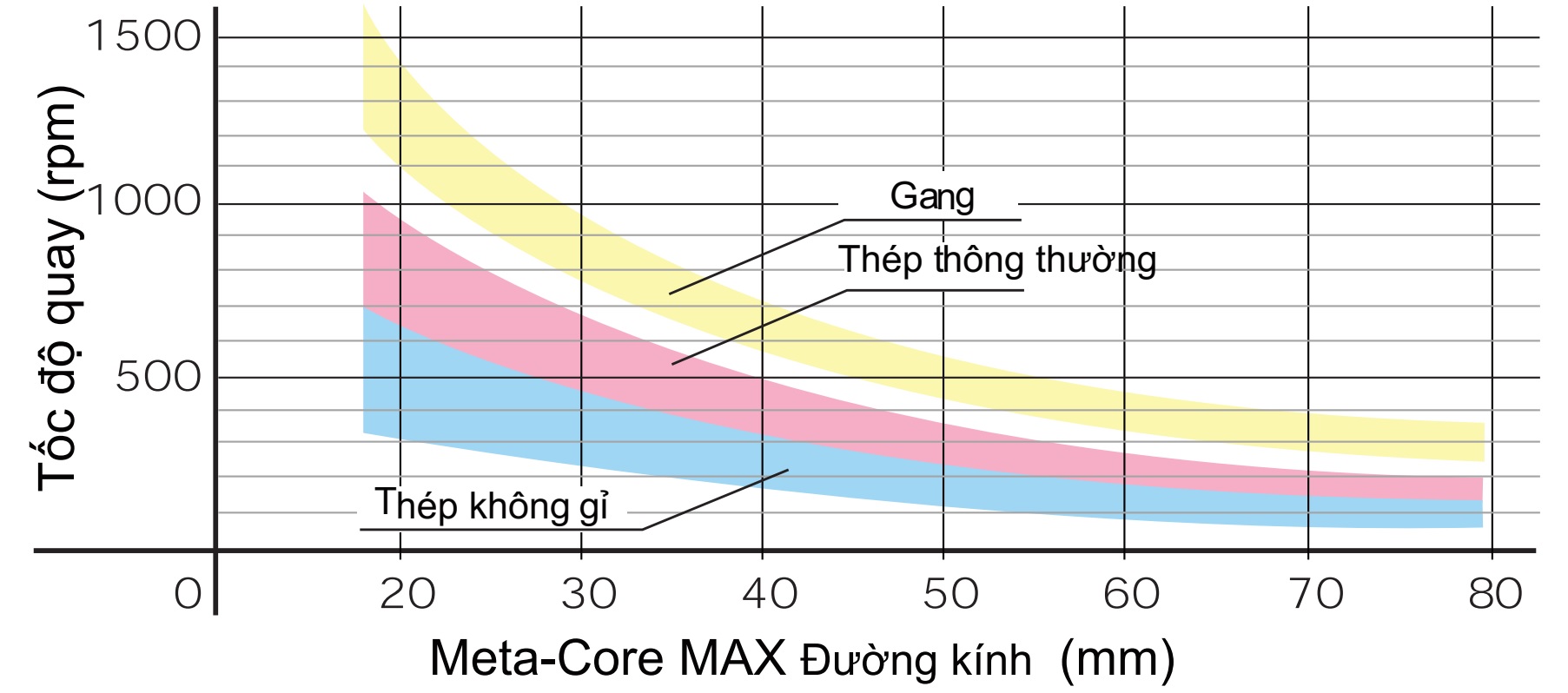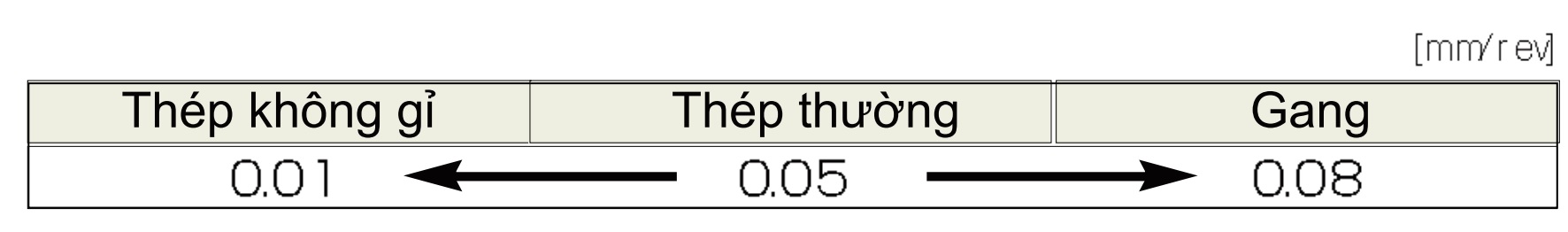 Thép thường = 40 - 60 m/min.Thép không gỉ = 20 - 40 m/min.Gang = 70 - 90 m/min