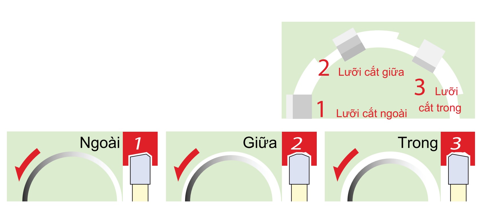 Với tổ hợp 3 cặp lưỡi cắt, gồm lưỡi cắt phía ngoài, lưỡi cắt giữa và lưỡi cắt trong, và với việc phân đoạn lần lượt 1/3 độ rộng bề mặt nên phôi dễ thoát ra ngoài. Ngoài ra, việc chia đều lực cắt cho các lưỡi hợp kim, giúp giảm mẻ lưỡi hợp kim
