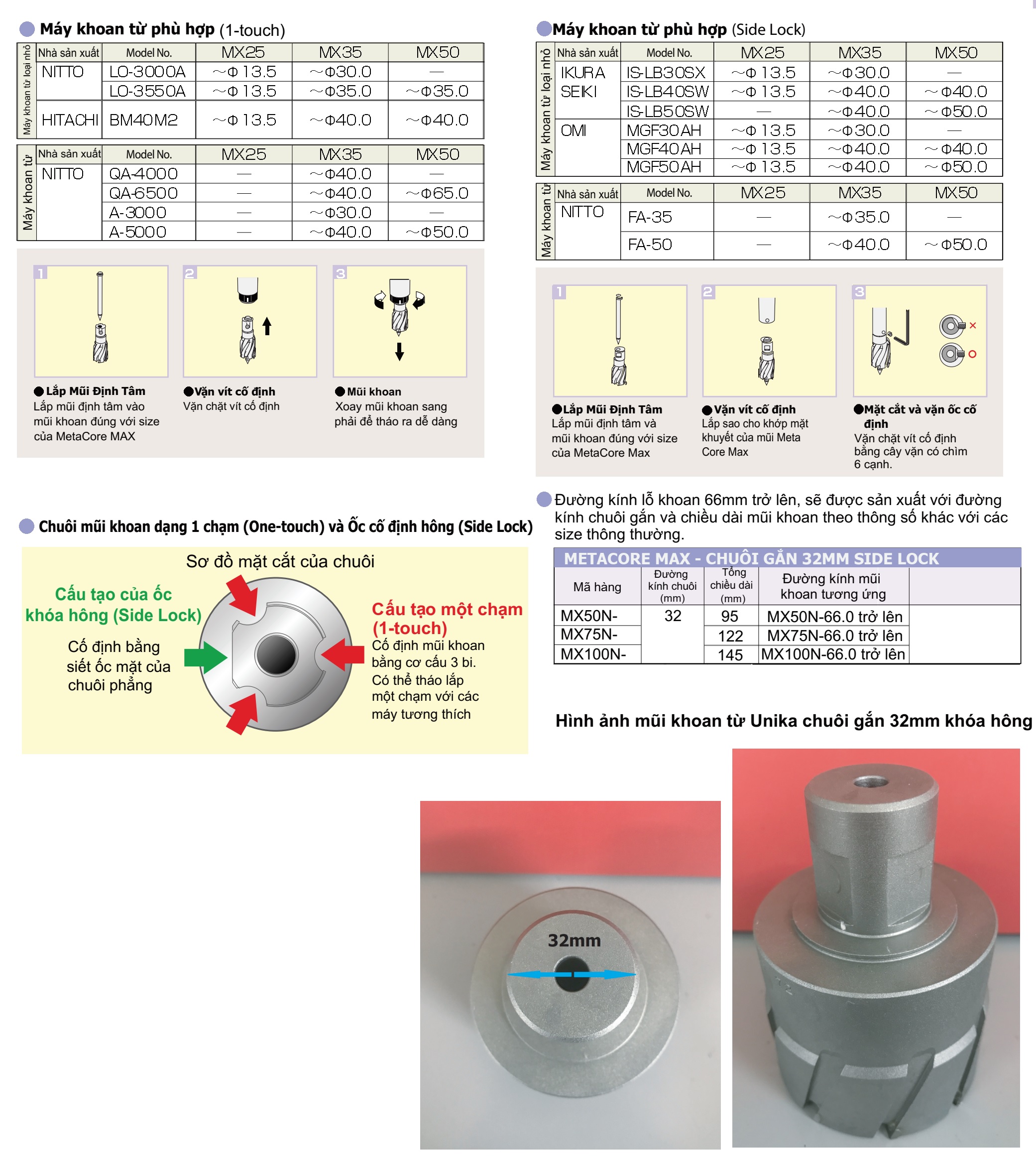 Thông số kỹ thuật của Mũi khoan từ hợp kim TCT - Unika MX35N-14.0| Mã hàng | Đường kính (mm) | Tổng chiều dài (mm) | Đường kính chuôi (mm) | Giá bán |